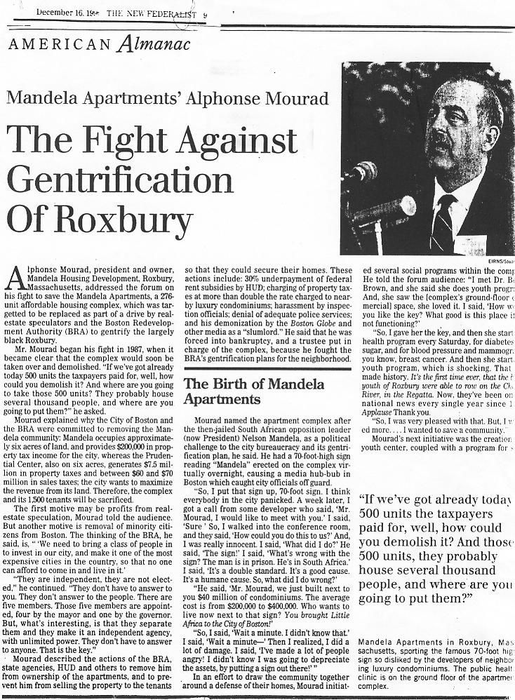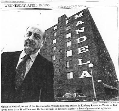 In addition to these articles, Mourad has also been covered by: CNN, The LA Times, and numerous radio and television outlets. For further information see tab entitled media on the website home page. While the vast majority of media coverage on Mourad's journey as owner of the Mandela development has been impartial, the Boston Globe consistently provided its readership with an inaccurate, prejudicial, slanted view of Mourad. So much so that Mourad claims the organization is responsible for his demise and as a result it landed in court with a $10 million deformation lawsuit. The following is an explanation of the events that led to the seizure of Mourad's property. $10 MILLION DEFAMATION SUIT FILED AGAINST THE BOSTON GLOBE BY ALPHONSE MOURAD in Suffolk Superior Court - Case Number 98-4585